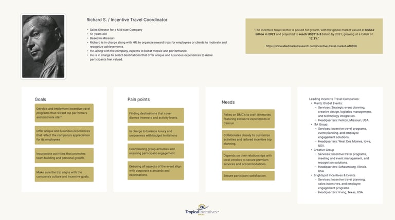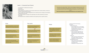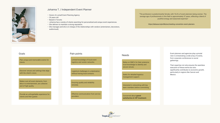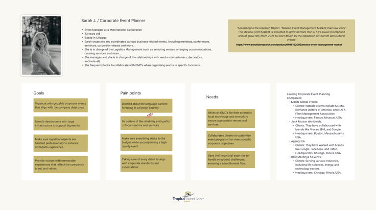 UX Research: User Personas I developed detailed User Personas to represent the core segments of the audience: Corporate Event Planners, Travel Agents, and Incentive Trip Organizers. This study allowed us to map specific pain points—such as difficulty in finding destination-specific services—and prioritize features that would facilitate a faster 'request for quote' process.